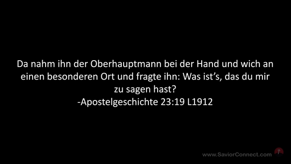 Da nahm ihn der Oberhauptmann bei der Hand und wich an einen besonderen Ort und fragte ihn: Was ist's, das du mir zu sagen hast? -Apostelgeschichte 23:19 L1912