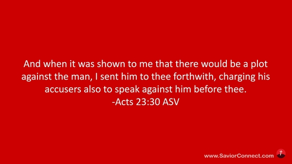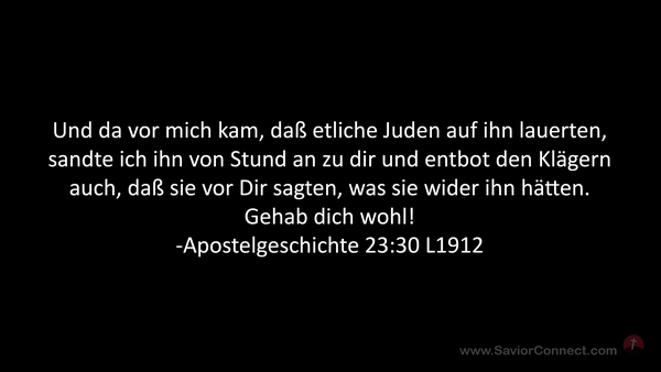 Und da vor mich kam, daß etliche Juden auf ihn lauerten, sandte ich ihn von Stund an zu dir und entbot den Klägern auch, daß sie vor Dir sagten, was sie wider ihn hätten. Gehab dich wohl! -Apostelgeschichte 23:30 L1912