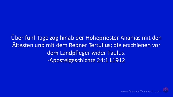 Über fünf Tage zog hinab der Hohepriester Ananias mit den Ältesten und mit dem Redner Tertullus; die erschienen vor dem Landpfleger wider Paulus. -Apostelgeschichte 24:1 L1912