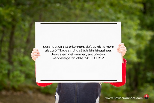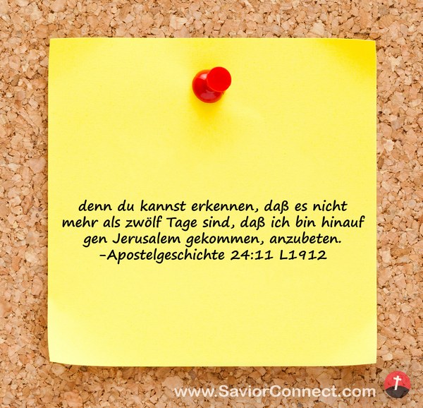 denn du kannst erkennen, daß es nicht mehr als zwölf Tage sind, daß ich bin hinauf gen Jerusalem gekommen, anzubeten. -Apostelgeschichte 24:11 L1912