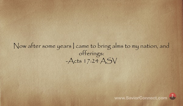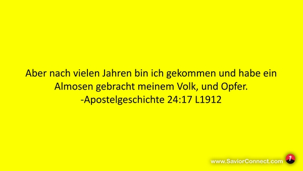 Aber nach vielen Jahren bin ich gekommen und habe ein Almosen gebracht meinem Volk, und Opfer. -Apostelgeschichte 24:17 L1912