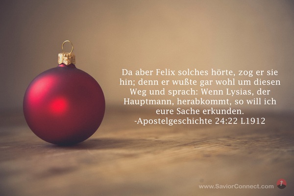 Da aber Felix solches hörte, zog er sie hin; denn er wußte gar wohl um diesen Weg und sprach: Wenn Lysias, der Hauptmann, herabkommt, so will ich eure Sache erkunden. -Apostelgeschichte 24:22 L1912