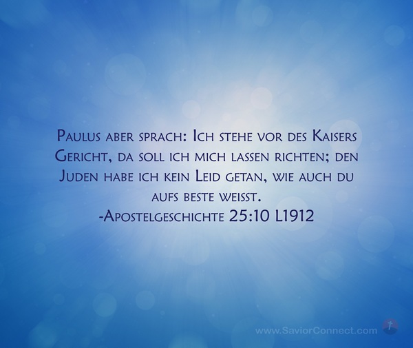 Paulus aber sprach: Ich stehe vor des Kaisers Gericht, da soll ich mich lassen richten; den Juden habe ich kein Leid getan, wie auch du aufs beste weißt. -Apostelgeschichte 25:10 L1912