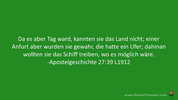 Da es aber Tag ward, kannten sie das Land nicht; einer Anfurt aber wurden sie gewahr, die hatte ein Ufer; dahinan wollten sie das Schiff treiben, wo es möglich wäre. -Apostelgeschichte 27:39 L1912