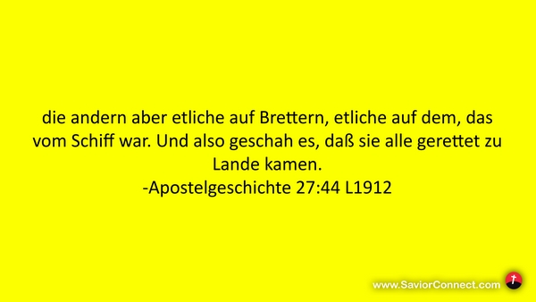 die andern aber etliche auf Brettern, etliche auf dem, das vom Schiff war. Und also geschah es, daß sie alle gerettet zu Lande kamen. -Apostelgeschichte 27:44 L1912