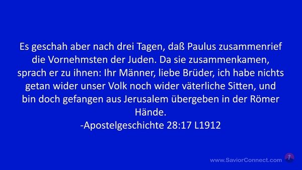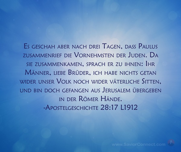 Es geschah aber nach drei Tagen, daß Paulus zusammenrief die Vornehmsten der Juden. Da sie zusammenkamen, sprach er zu ihnen: Ihr Männer, liebe Brüder, ich habe nichts getan wider unser Volk noch wider väterliche Sitten, und bin doch gefangen aus Jerusalem übergeben in der Römer Hände. -Apostelgeschichte 28:17 L1912