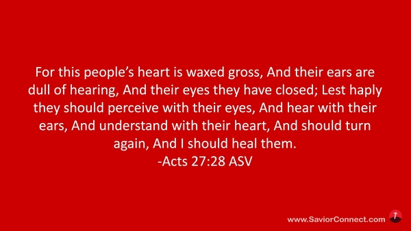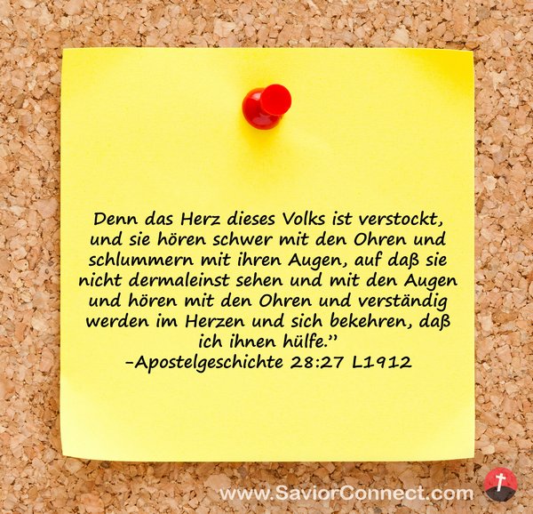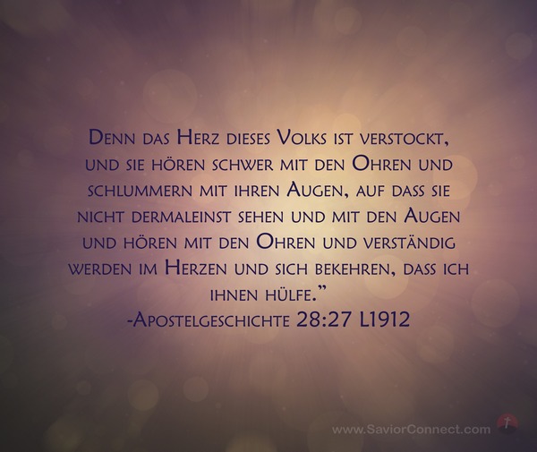 Denn das Herz dieses Volks ist verstockt, und sie hören schwer mit den Ohren und schlummern mit ihren Augen, auf daß sie nicht dermaleinst sehen und mit den Augen und hören mit den Ohren und verständig werden im Herzen und sich bekehren, daß ich ihnen hülfe.” -Apostelgeschichte 28:27 L1912
