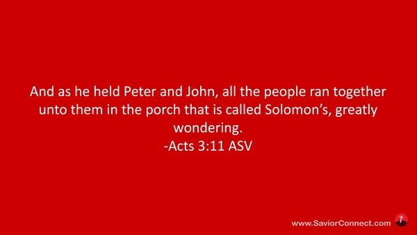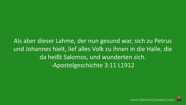 Als aber dieser Lahme, der nun gesund war, sich zu Petrus und Johannes hielt, lief alles Volk zu ihnen in die Halle, die da heißt Salomos, und wunderten sich. -Apostelgeschichte 3:11 L1912
