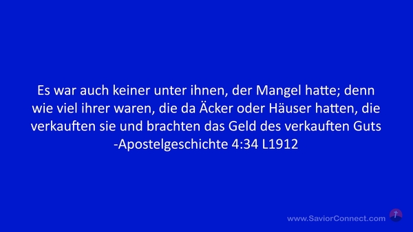 Es war auch keiner unter ihnen, der Mangel hatte; denn wie viel ihrer waren, die da Äcker oder Häuser hatten, die verkauften sie und brachten das Geld des verkauften Guts -Apostelgeschichte 4:34 L1912