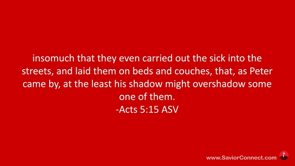 also daß sie die Kranken auf die Gassen heraustrugen und legten sie auf Betten und Bahren, auf daß, wenn Petrus käme, sein Schatten ihrer etliche überschattete. -Apostelgeschichte 5:15 L1912