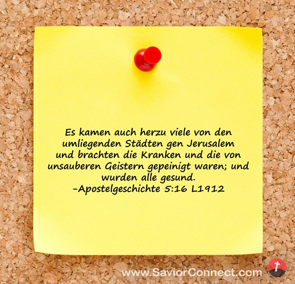 Es kamen auch herzu viele von den umliegenden Städten gen Jerusalem und brachten die Kranken und die von unsauberen Geistern gepeinigt waren; und wurden alle gesund. -Apostelgeschichte 5:16 L1912