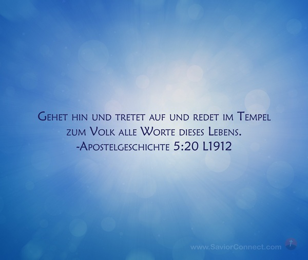 Gehet hin und tretet auf und redet im Tempel zum Volk alle Worte dieses Lebens. -Apostelgeschichte 5:20 L1912