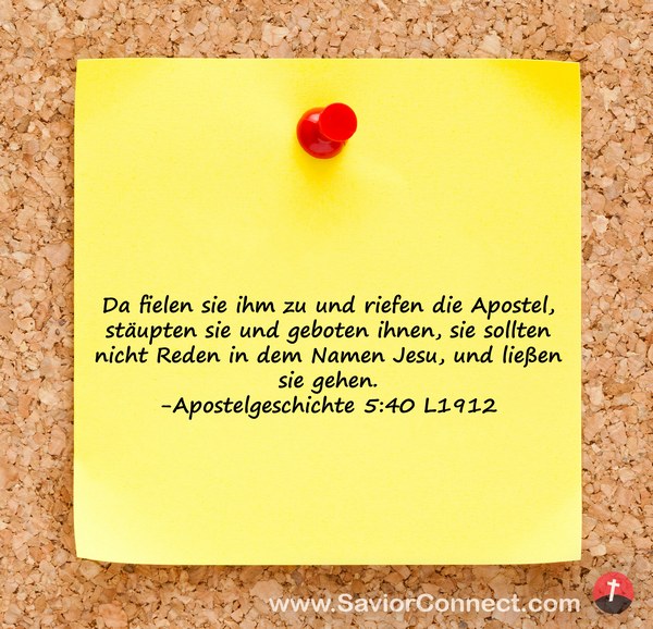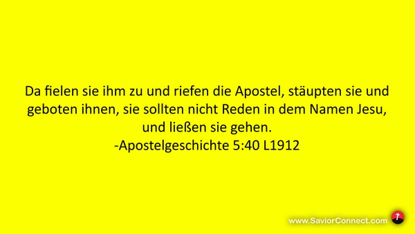 Da fielen sie ihm zu und riefen die Apostel, stäupten sie und geboten ihnen, sie sollten nicht Reden in dem Namen Jesu, und ließen sie gehen. -Apostelgeschichte 5:40 L1912