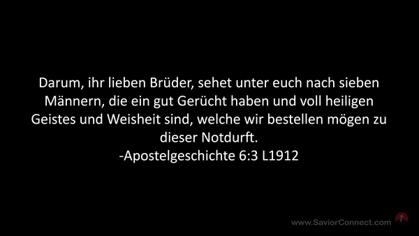 Darum, ihr lieben Brüder, sehet unter euch nach sieben Männern, die ein gut Gerücht haben und voll heiligen Geistes und Weisheit sind, welche wir bestellen mögen zu dieser Notdurft. -Apostelgeschichte 6:3 L1912
