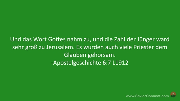 Und das Wort Gottes nahm zu, und die Zahl der Jünger ward sehr groß zu Jerusalem. Es wurden auch viele Priester dem Glauben gehorsam. -Apostelgeschichte 6:7 L1912