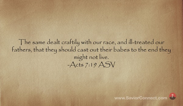 Dieser trieb Hinterlist mit unserm Geschlecht und behandelte unsre Väter übel und schaffte, daß man die jungen Kindlein aussetzen mußte, daß sie nicht lebendig blieben. -Apostelgeschichte 7:19 L1912