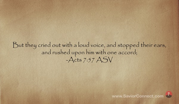 Sie schrieen aber laut und hielten ihre Ohren zu und stürmten einmütig auf ihn ein, stießen ihn zur Stadt hinaus und steinigten ihn. -Apostelgeschichte 7:57 L1912