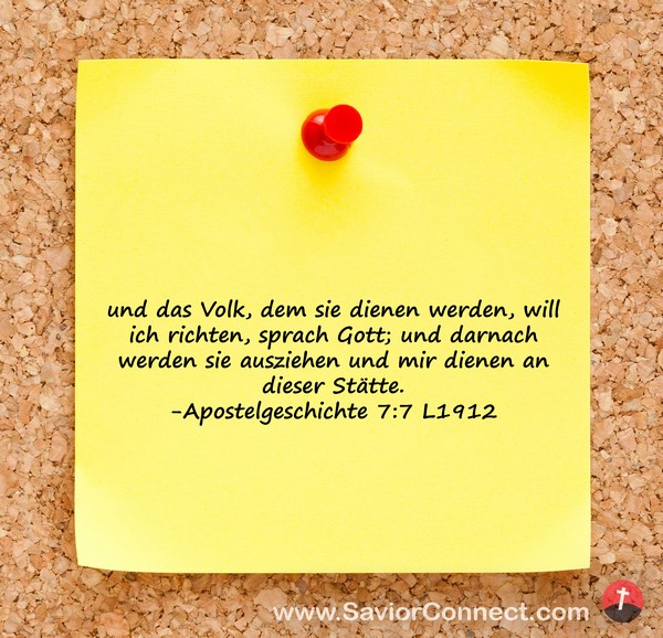 und das Volk, dem sie dienen werden, will ich richten, sprach Gott; und darnach werden sie ausziehen und mir dienen an dieser Stätte. -Apostelgeschichte 7:7 L1912