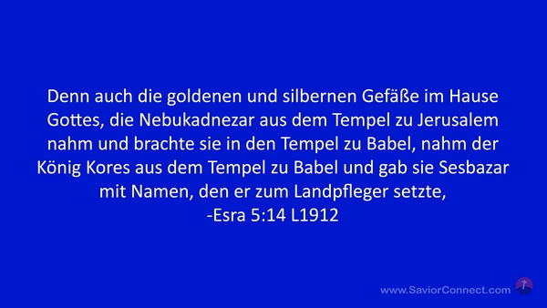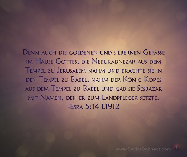Denn auch die goldenen und silbernen Gefäße im Hause Gottes, die Nebukadnezar aus dem Tempel zu Jerusalem nahm und brachte sie in den Tempel zu Babel, nahm der König Kores aus dem Tempel zu Babel und gab sie Sesbazar mit Namen, den er zum Landpfleger setzte, -Esra 5:14 L1912