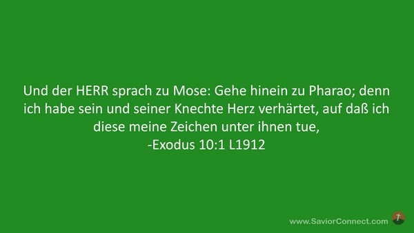 Und der HERR sprach zu Mose: Gehe hinein zu Pharao; denn ich habe sein und seiner Knechte Herz verhärtet, auf daß ich diese meine Zeichen unter ihnen tue, -Exodus 10:1 L1912