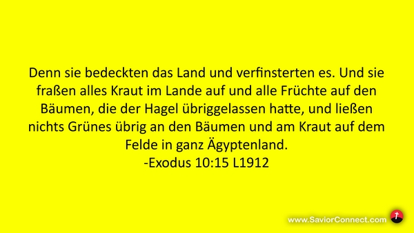 Denn sie bedeckten das Land und verfinsterten es. Und sie fraßen alles Kraut im Lande auf und alle Früchte auf den Bäumen, die der Hagel übriggelassen hatte, und ließen nichts Grünes übrig an den Bäumen und am Kraut auf dem Felde in ganz Ägyptenland. -Exodus 10:15 L1912