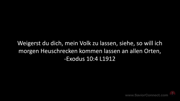 Weigerst du dich, mein Volk zu lassen, siehe, so will ich morgen Heuschrecken kommen lassen an allen Orten, -Exodus 10:4 L1912