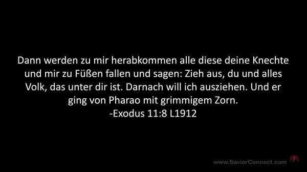 Dann werden zu mir herabkommen alle diese deine Knechte und mir zu Füßen fallen und sagen: Zieh aus, du und alles Volk, das unter dir ist. Darnach will ich ausziehen. Und er ging von Pharao mit grimmigem Zorn. -Exodus 11:8 L1912