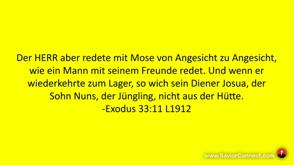 Der HERR aber redete mit Mose von Angesicht zu Angesicht, wie ein Mann mit seinem Freunde redet. Und wenn er wiederkehrte zum Lager, so wich sein Diener Josua, der Sohn Nuns, der Jüngling, nicht aus der Hütte. -Exodus 33:11 L1912