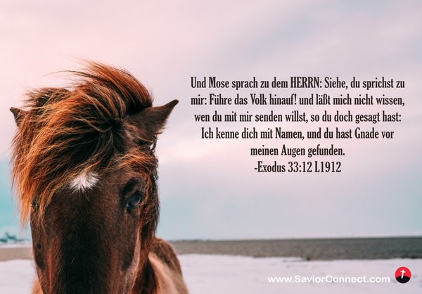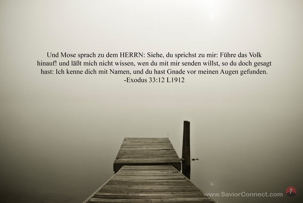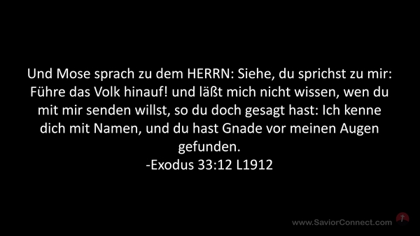 Und Mose sprach zu dem HERRN: Siehe, du sprichst zu mir: Führe das Volk hinauf! und läßt mich nicht wissen, wen du mit mir senden willst, so du doch gesagt hast: Ich kenne dich mit Namen, und du hast Gnade vor meinen Augen gefunden. -Exodus 33:12 L1912
