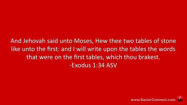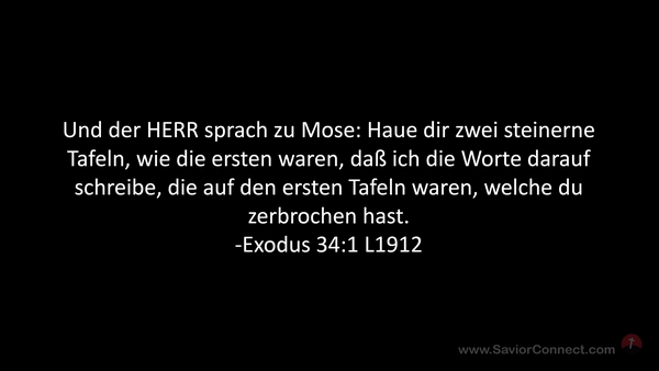 Und der HERR sprach zu Mose: Haue dir zwei steinerne Tafeln, wie die ersten waren, daß ich die Worte darauf schreibe, die auf den ersten Tafeln waren, welche du zerbrochen hast. -Exodus 34:1 L1912