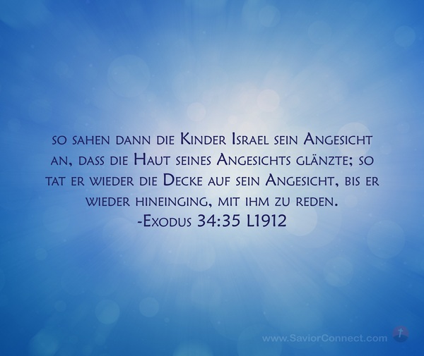 so sahen dann die Kinder Israel sein Angesicht an, daß die Haut seines Angesichts glänzte; so tat er wieder die Decke auf sein Angesicht, bis er wieder hineinging, mit ihm zu reden. -Exodus 34:35 L1912