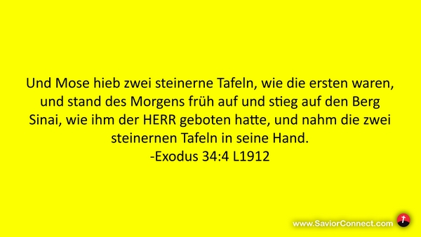 Und Mose hieb zwei steinerne Tafeln, wie die ersten waren, und stand des Morgens früh auf und stieg auf den Berg Sinai, wie ihm der HERR geboten hatte, und nahm die zwei steinernen Tafeln in seine Hand. -Exodus 34:4 L1912