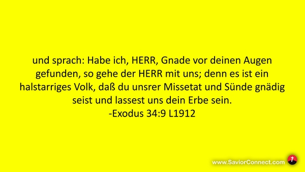 und sprach: Habe ich, HERR, Gnade vor deinen Augen gefunden, so gehe der HERR mit uns; denn es ist ein halstarriges Volk, daß du unsrer Missetat und Sünde gnädig seist und lassest uns dein Erbe sein. -Exodus 34:9 L1912