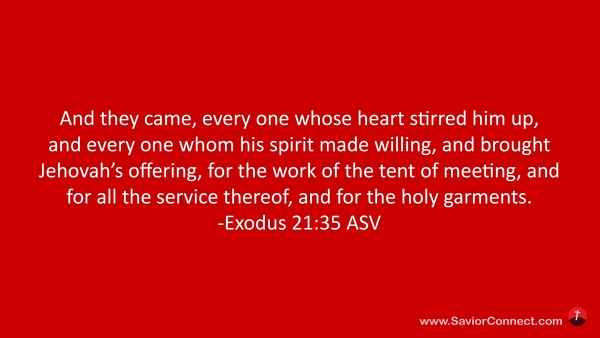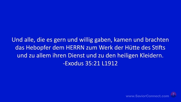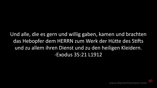 Und alle, die es gern und willig gaben, kamen und brachten das Hebopfer dem HERRN zum Werk der Hütte des Stifts und zu allem ihren Dienst und zu den heiligen Kleidern. -Exodus 35:21 L1912