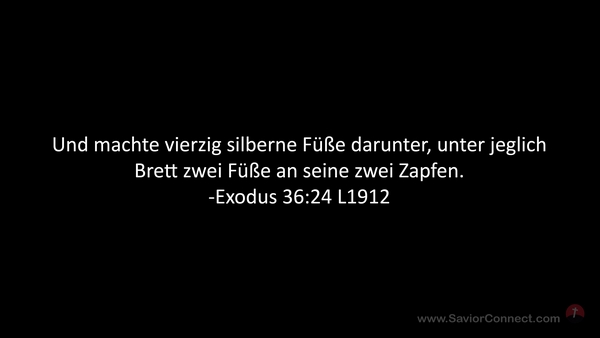Und machte vierzig silberne Füße darunter, unter jeglich Brett zwei Füße an seine zwei Zapfen. -Exodus 36:24 L1912