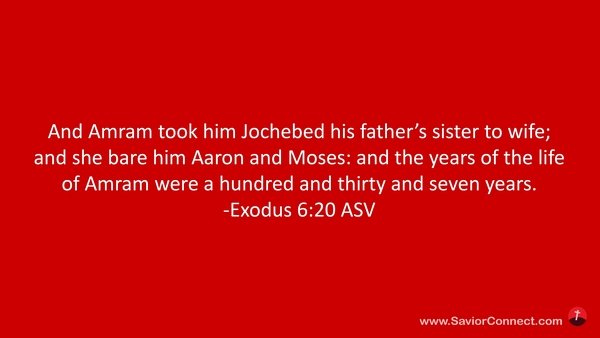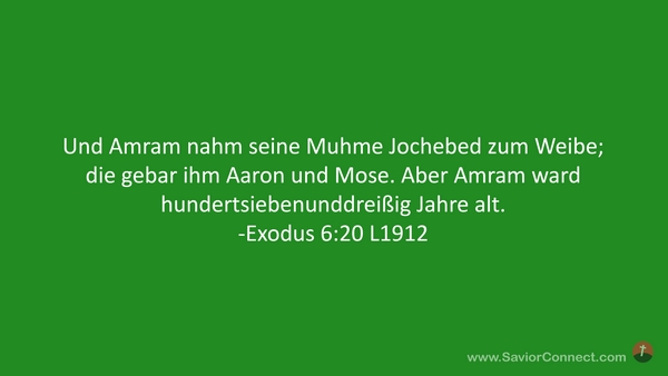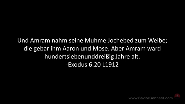 Und Amram nahm seine Muhme Jochebed zum Weibe; die gebar ihm Aaron und Mose. Aber Amram ward hundertsiebenunddreißig Jahre alt. -Exodus 6:20 L1912