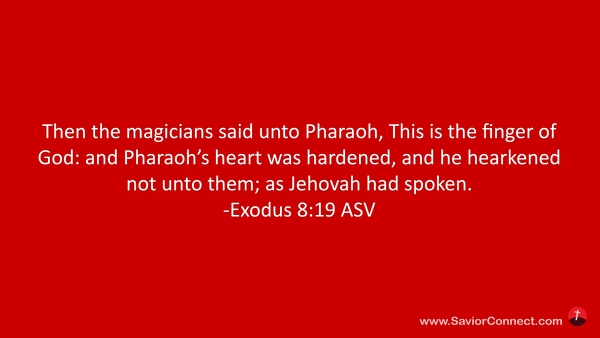 8:15 Da sprachen die Zauberer zu Pharao: Das ist Gottes Finger. Aber das Herz Pharaos ward verstockt, und er hörte sie nicht, wie denn der HERR gesagt hatte. -Exodus 8:19 L1912
