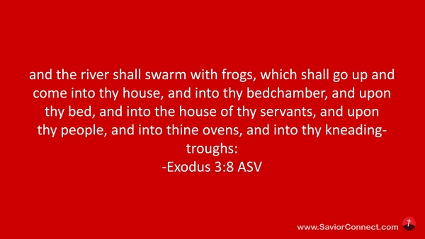 7:28 daß der Strom soll von Fröschen wimmeln; die sollen heraufkriechen und kommen in dein Haus, in deine Schlafkammer, auch in die Häuser deiner Knechte, unter dein Volk, in deine Backöfen und in deine Teige; -Exodus 8:3 L1912