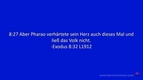 8:27 Aber Pharao verhärtete sein Herz auch dieses Mal und ließ das Volk nicht. -Exodus 8:32 L1912