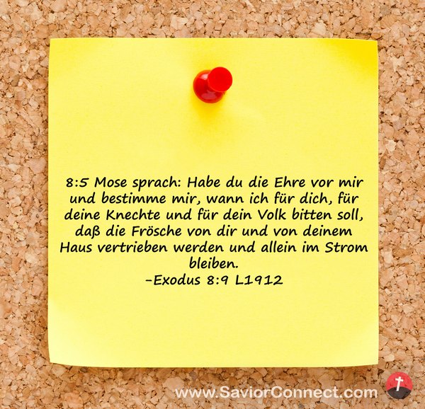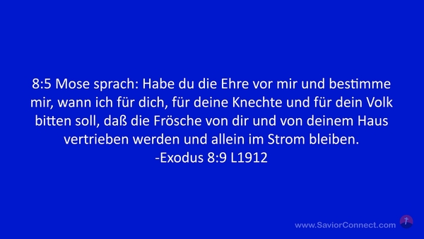 8:5 Mose sprach: Habe du die Ehre vor mir und bestimme mir, wann ich für dich, für deine Knechte und für dein Volk bitten soll, daß die Frösche von dir und von deinem Haus vertrieben werden und allein im Strom bleiben. -Exodus 8:9 L1912