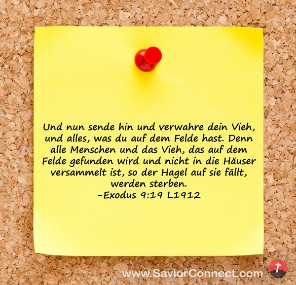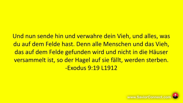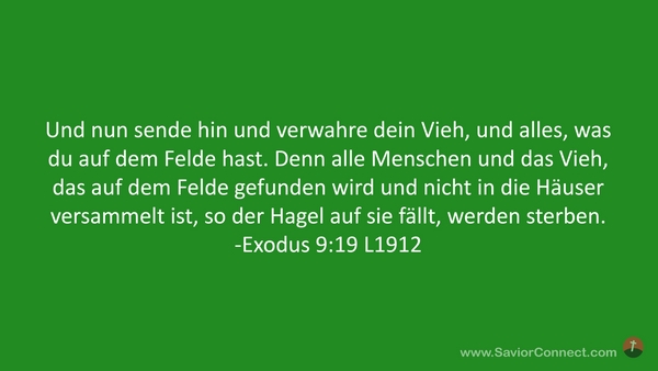 Und nun sende hin und verwahre dein Vieh, und alles, was du auf dem Felde hast. Denn alle Menschen und das Vieh, das auf dem Felde gefunden wird und nicht in die Häuser versammelt ist, so der Hagel auf sie fällt, werden sterben. -Exodus 9:19 L1912