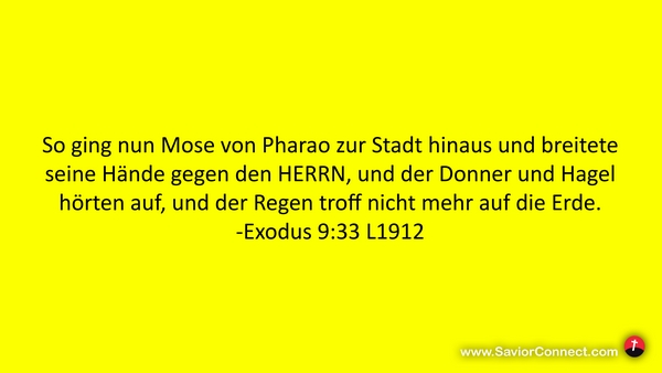 So ging nun Mose von Pharao zur Stadt hinaus und breitete seine Hände gegen den HERRN, und der Donner und Hagel hörten auf, und der Regen troff nicht mehr auf die Erde. -Exodus 9:33 L1912