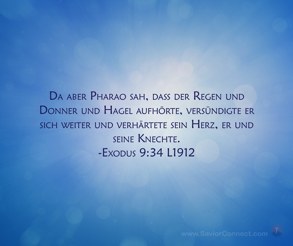 Da aber Pharao sah, daß der Regen und Donner und Hagel aufhörte, versündigte er sich weiter und verhärtete sein Herz, er und seine Knechte. -Exodus 9:34 L1912