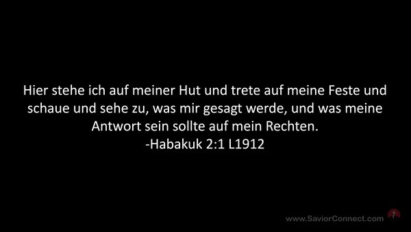 Hier stehe ich auf meiner Hut und trete auf meine Feste und schaue und sehe zu, was mir gesagt werde, und was meine Antwort sein sollte auf mein Rechten. -Habakuk 2:1 L1912