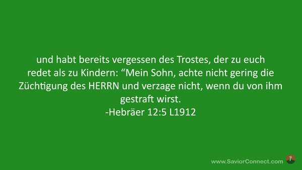 und habt bereits vergessen des Trostes, der zu euch redet als zu Kindern: “Mein Sohn, achte nicht gering die Züchtigung des HERRN und verzage nicht, wenn du von ihm gestraft wirst. -Hebräer 12:5 L1912