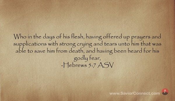 Und er hat in den Tagen seines Fleisches Gebet und Flehen mit starkem Geschrei und Tränen geopfert zu dem, der ihm von dem Tode konnte aushelfen; und ist auch erhört, darum daß er Gott in Ehren hatte. -Hebräer 5:7 L1912