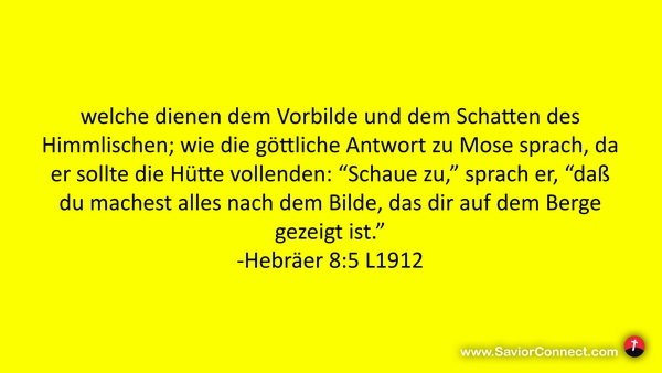 welche dienen dem Vorbilde und dem Schatten des Himmlischen; wie die göttliche Antwort zu Mose sprach, da er sollte die Hütte vollenden: “Schaue zu,” sprach er, “daß du machest alles nach dem Bilde, das dir auf dem Berge gezeigt ist.” -Hebräer 8:5 L1912