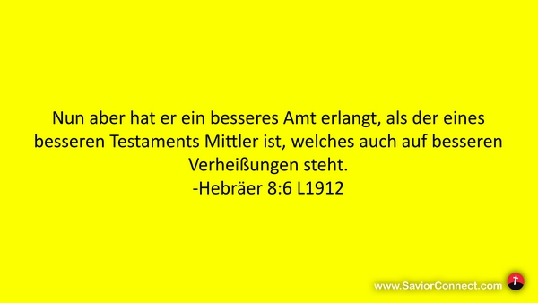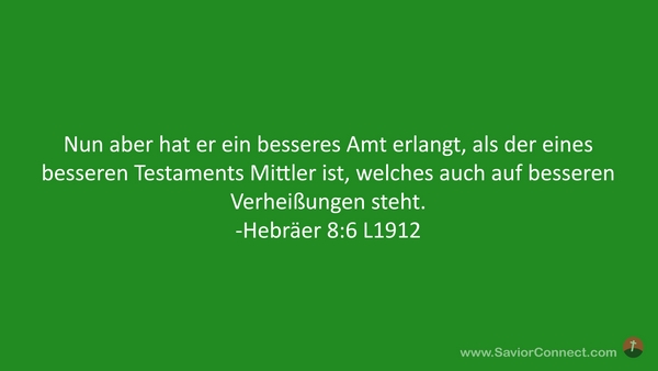 Nun aber hat er ein besseres Amt erlangt, als der eines besseren Testaments Mittler ist, welches auch auf besseren Verheißungen steht. -Hebräer 8:6 L1912