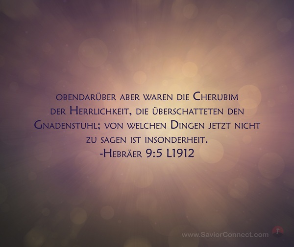 obendarüber aber waren die Cherubim der Herrlichkeit, die überschatteten den Gnadenstuhl; von welchen Dingen jetzt nicht zu sagen ist insonderheit. -Hebräer 9:5 L1912
