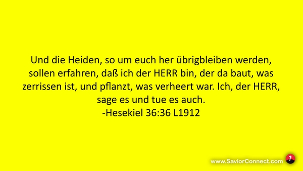 Und die Heiden, so um euch her übrigbleiben werden, sollen erfahren, daß ich der HERR bin, der da baut, was zerrissen ist, und pflanzt, was verheert war. Ich, der HERR, sage es und tue es auch. -Hesekiel 36:36 L1912